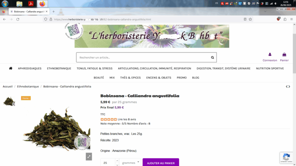 Un usager nous a contacté pour partager sa mésaventure récente (preuves à l’appui). Ayant acheté une plante chamanique (bobinsana alias calliandra augustifolia, utilisé notamment par les chamans dans les « diètes » en Amazonie) sur la boutique française Herboristerie Y*****k B*hb*t, et ayant eu des effets bien plus forts qu’attendu, il voulait laisser son avis dans les commentaires qu’on peut faire après achat.