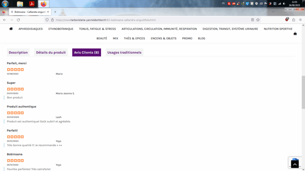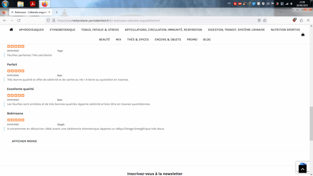 Après avoir contacté le shop en question, on lui a expliqué que « la législation française nous interdit de formuler tout conseil d’utilisation ou posologie concernant les plantes que nous vendons. L’avis que vous avez déposé concernant le Bobinsana aurait pû être assimilé à du conseil, raison pour laquelle nous ne l’avons pas publié. »